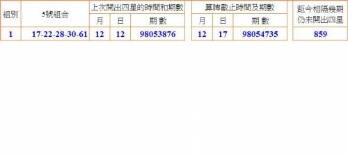 3.建議一組859期仍未出四星(98053876~~98054735)的五星組合(17-22-28-30-61)。