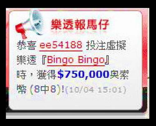 [求助] (10-04) 恭喜 ee54188 投注虛擬樂透『Bingo Bingo』時,獲得$750,000奥索幣 (8中8)!