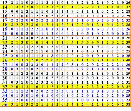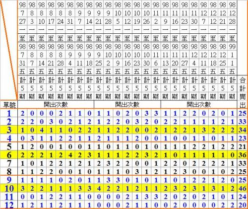 二、表A為單號(1~36號)的開出次數統計;表B為各條線的開出次數統計。