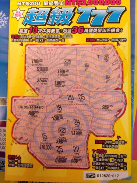 討論版列表 » 刮刮樂討論版 » [分享] (12-27) 超級777 TTH 回應本話題 發表新話題