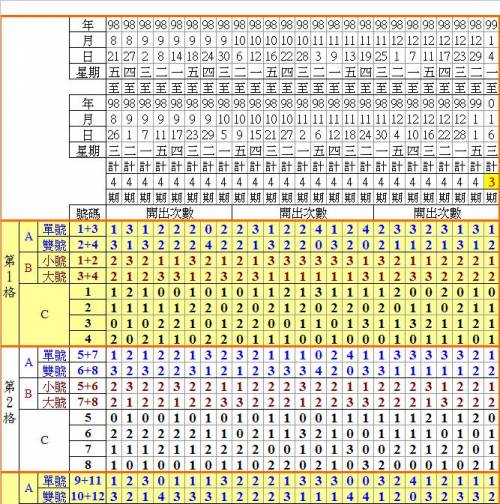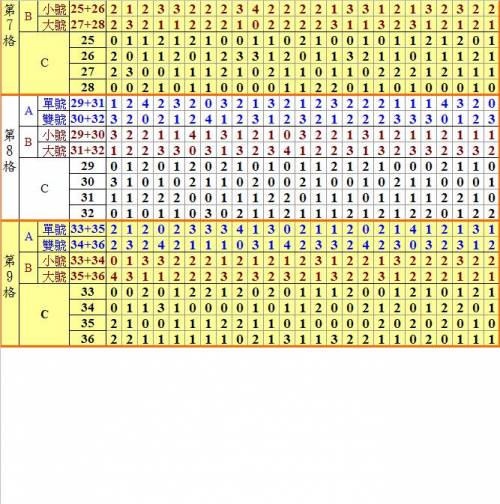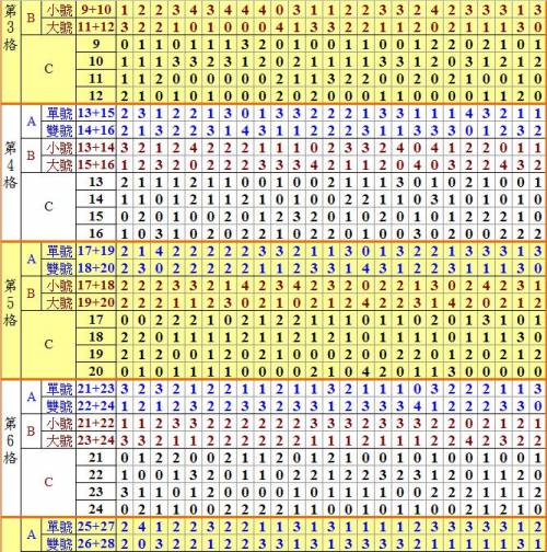 二、每一格都分為A,B,C三部份:用法是先由A判斷其較可能出單號或出雙號;或B較可能出大號或出小號,最後再由C考慮最後要使用的可能單一號碼。