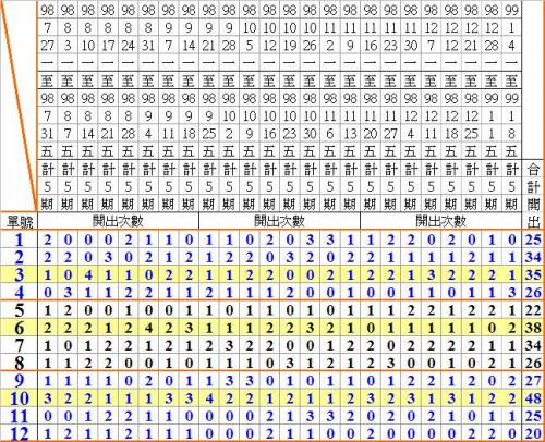二、表A為單號(1~36號)的開出次數統計;表B為各條線的開出次數統計。