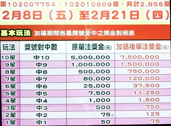 二、實施期別:電腦型彩券「BINGO BINGO 賓果賓果」102007754~102010609期(102/2/8至102/2/21), 共計2,856期。