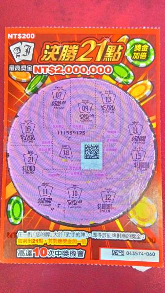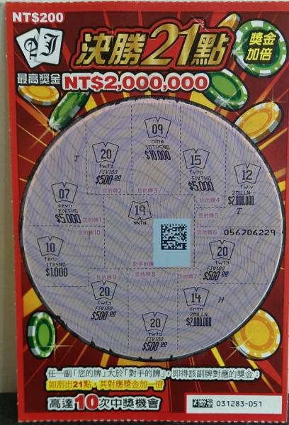 我在7月中旬,在某工業區內的彩券行買決勝21點連號3張,其中一張刮中TTH,而且對手的牌是20點,而我的牌是21點,加倍獎金2倍