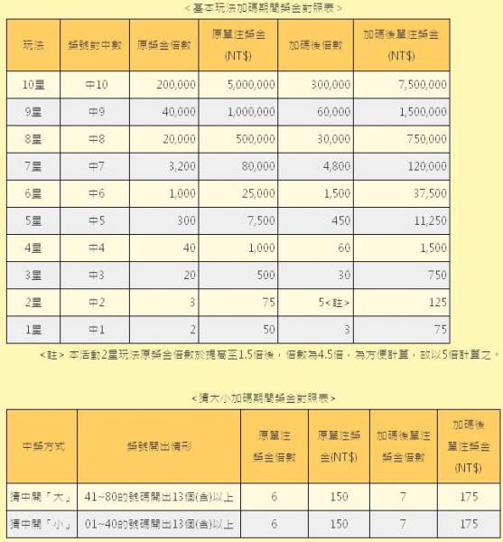 (1)本活動期間,各星玩法中之「基本玩法獎金表」獎號全中之獎金金額提高至1.5倍(含原始獎金倍數之1倍)、附加玩法猜大小獎金倍數由6倍提高至7倍;其餘其他獎項獎金倍數維持不變。舉例說明如下: