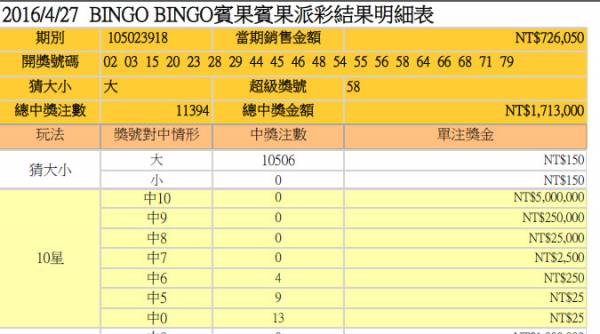 2016年4月27日 賓果銷售金額和獎金,包含1到10星被中10000元以上的時間,如有錯誤以台彩為準