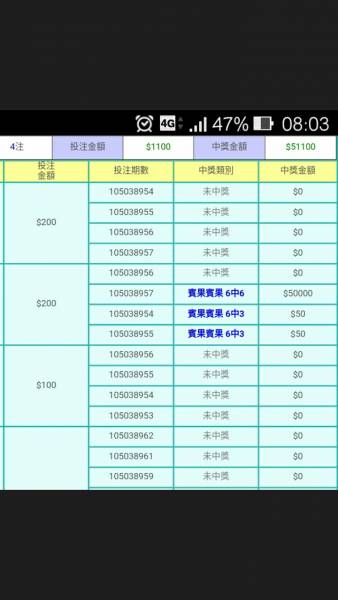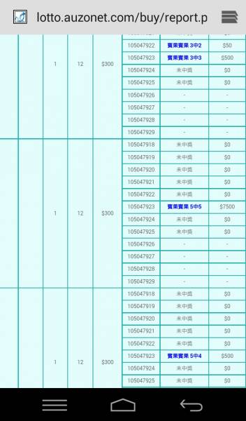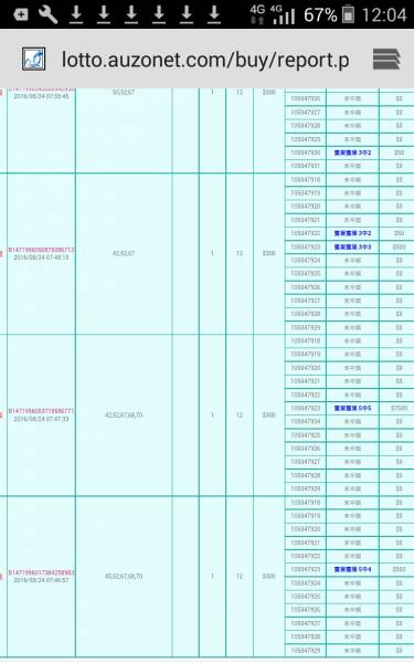 當初的投注資料 已經被洗掉了因為奧索只保留一個月 這是我當時用手機截圖的 我記得投注的號碼是九尾的...09*19*29*39*49*59 因為是中六星所以印像很深刻