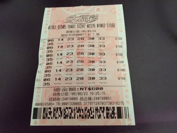 105期中獎號碼06、15、19、23、28、30、33、特20