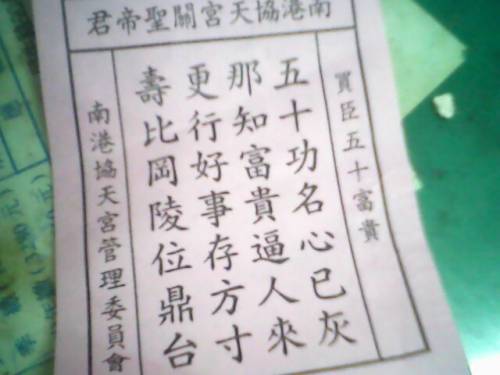 籤曰:本籤詩示之於君爾之意也,如賈臣五十富貴之屬,文曰:五十功名心已灰,那知富貴逼人來,如此之命運,即為幾十年來之福報。功名進退,一旦逢時運,富貴逼人而來,事能如此,皆以善所基,爰之神佛示之曰:更行好事存方寸,壽比岡陵位鼎台之田地,更行好事,壽高貴顯者耶。此籤大吉利。婚可成。財漸亨。病漸安康。孕生男。名利遲。後必豐。家道昌。墳宅平。行好事。福祿遂。凡百事如意也。