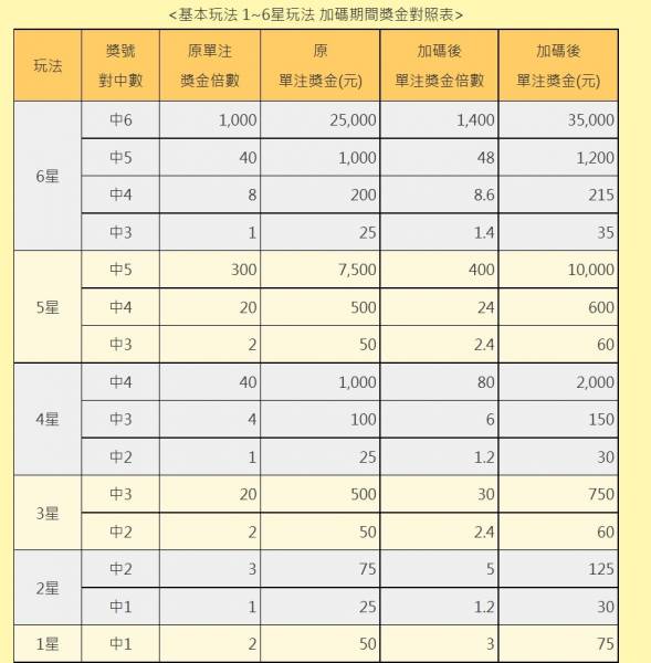 (1) 本活動期間,「基本玩法」1~6星玩法全獎項提高中獎獎金,各獎項依下表之加碼後單注獎金給獎;其餘獎項獎金維持不變。