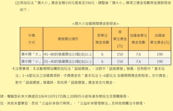 2) 附加玩法「猜大小」獎金金額150元提高至190元。調整後「猜大小」獎項之獎金倍數與金額對照表如下: