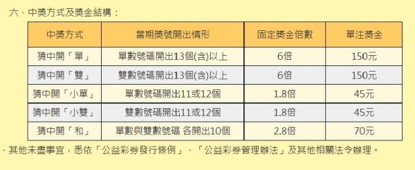 玩法:購券者可就「BINGO BINGO賓果賓果」當期開出的20個獎號中,單數(01、03、05~77、79)號碼與雙數(02、04、06~78、80)號碼所開出的個數進行預測。可能的開獎結果有以下5種,購券者可依其預測進行投注,投注內容符合以下情形即為中獎: