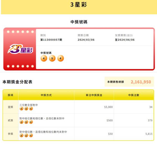 [其它] (03-07) [資訊]113年3月06日三星彩開獎結果