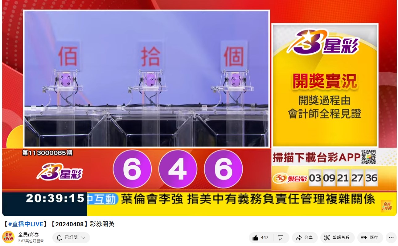 專區【全民i彩券】台灣彩券開獎實況轉播 威力彩、今彩539、三星彩、四星彩 |三立新聞網 SETN.com - YouTube