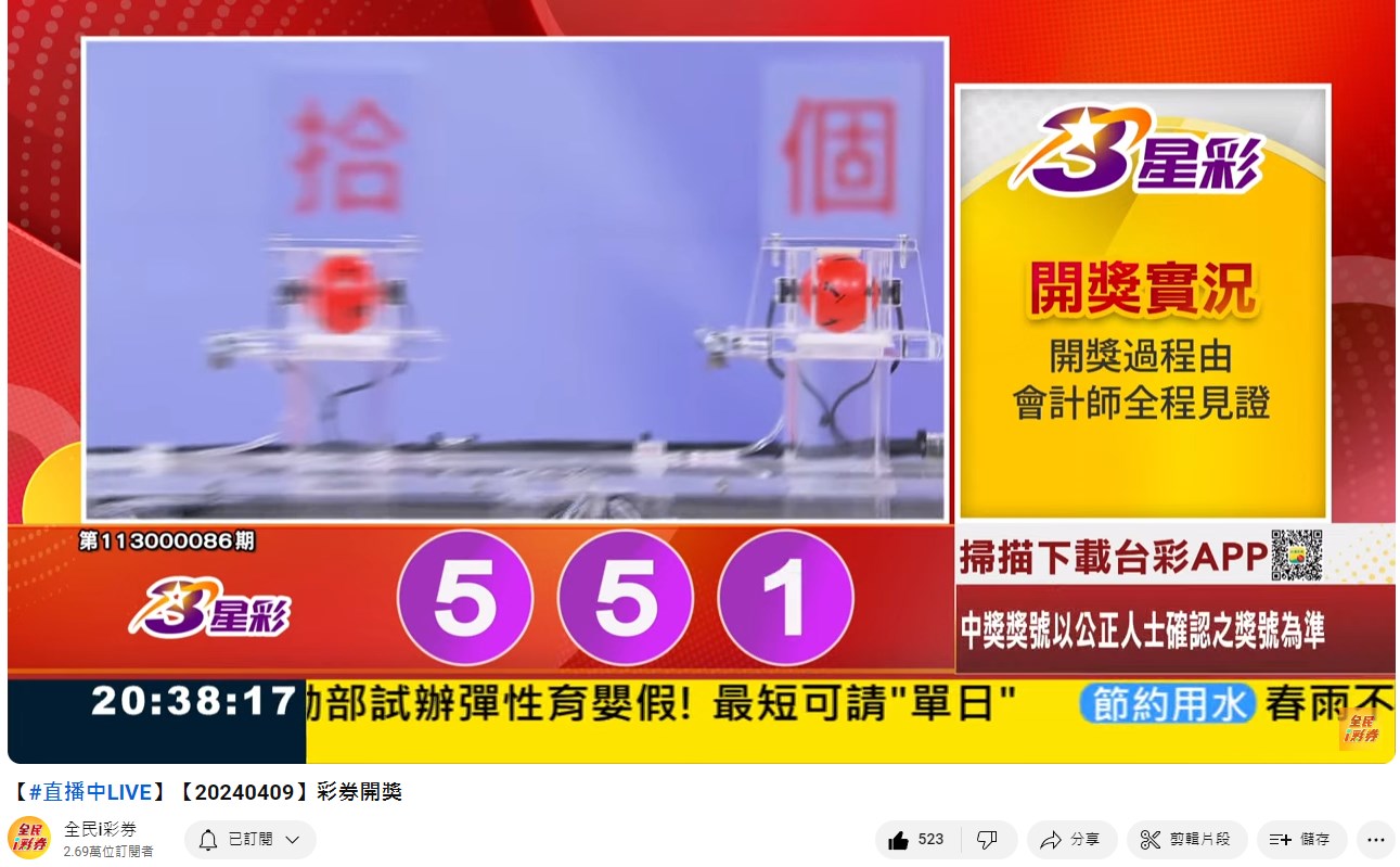 備註: 台彩因給全民兌獎方便,會在電視節目播完後,於全民i彩券YT官方頻道