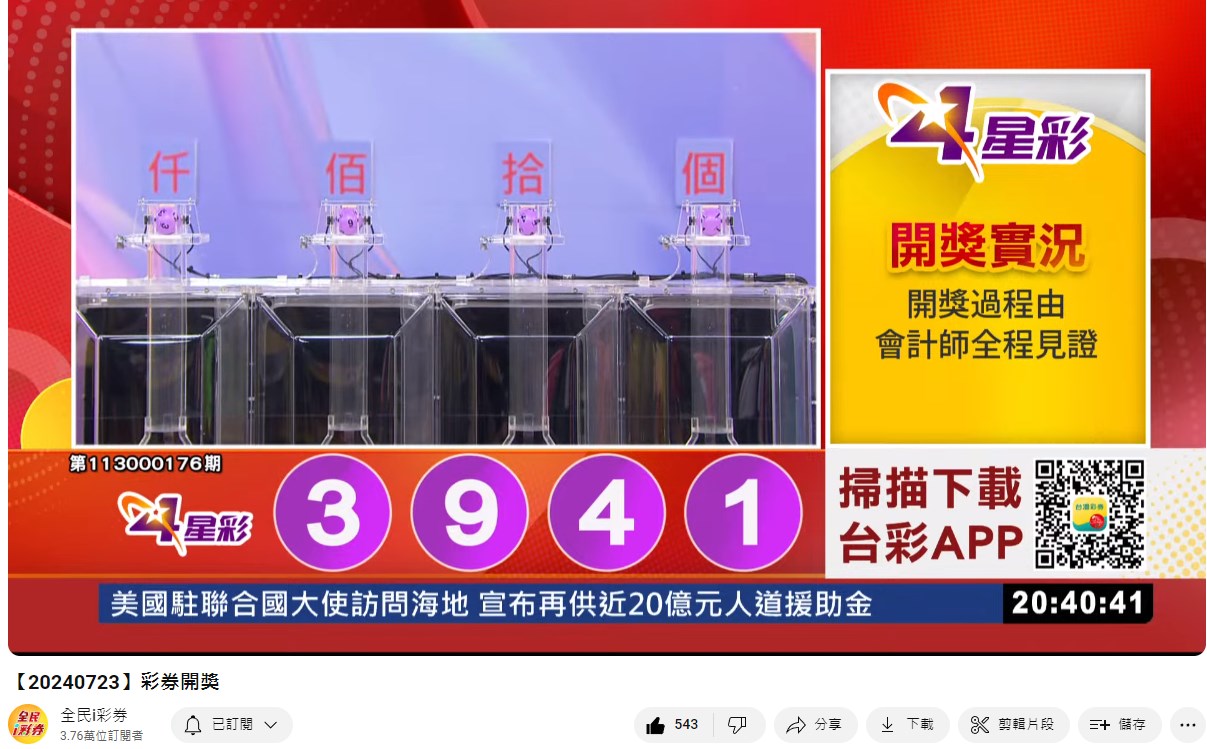 備註: 台彩因給全民兌獎方便,會在電視節目播完後,於全民i彩券YT官方頻道