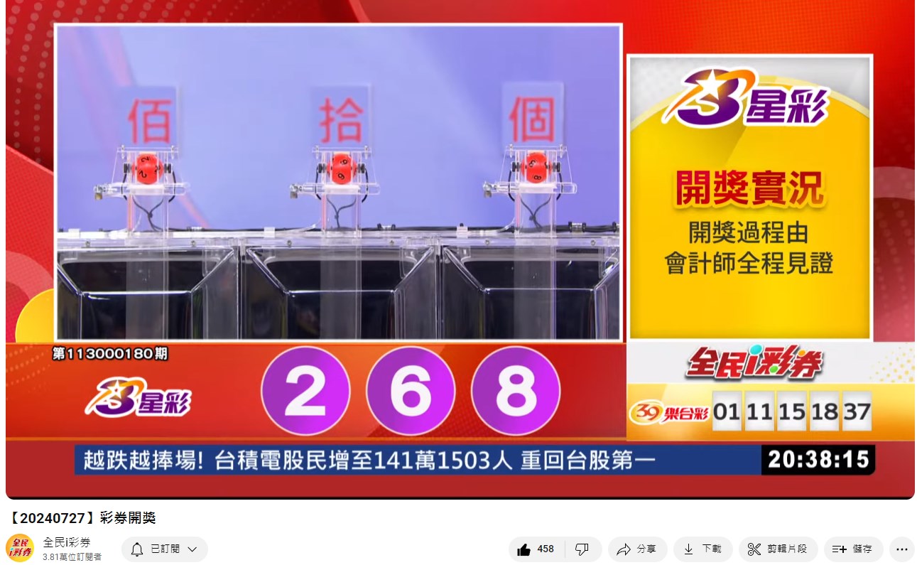 備註: 台彩因給全民兌獎方便,會在電視節目播完後,於全民i彩券YT官方頻道