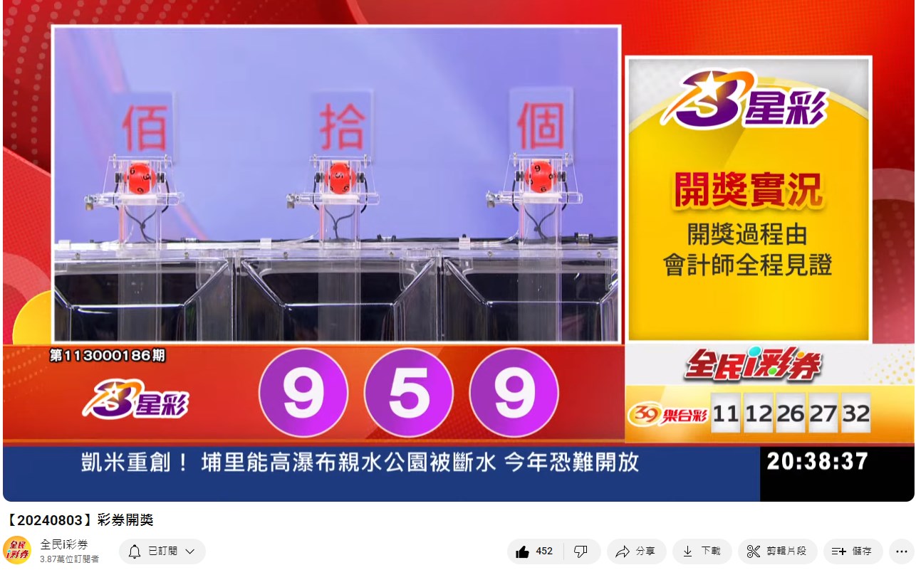 備註: 台彩因給全民兌獎方便,會在電視節目播完後,於全民i彩券YT官方頻道