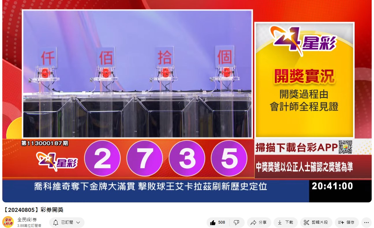備註: 台彩因給全民兌獎方便,會在電視節目播完後,於全民i彩券YT官方頻道