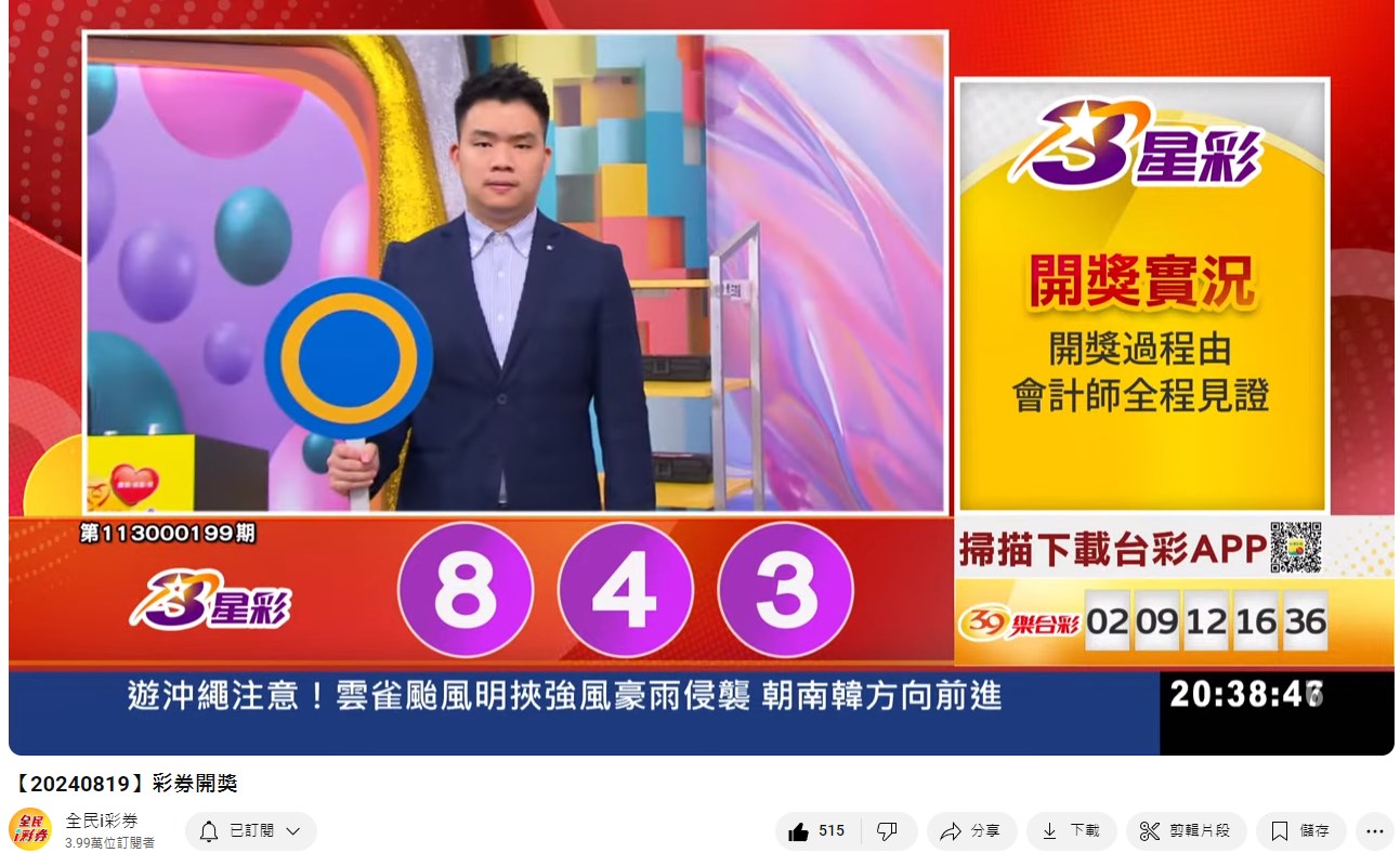 備註: 台彩因給全民兌獎方便,會在電視節目播完後,於全民i彩券YT官方頻道