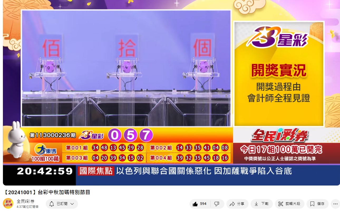 備註: 台彩因給全民兌獎方便,會在電視節目播完後,於全民i彩券YT官方頻道