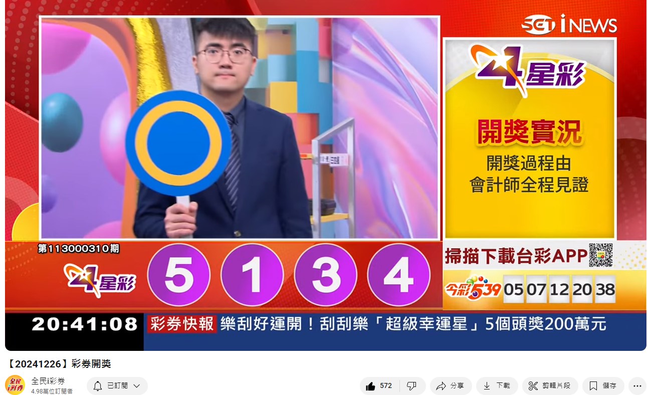 備註: 台彩因給全民兌獎方便,會在電視節目播完後,於全民i彩券YT官方頻道