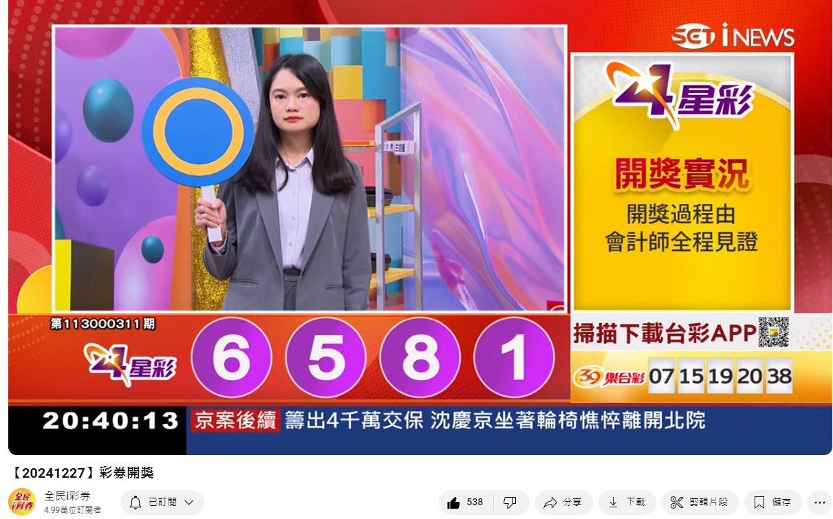 備註: 台彩因給全民兌獎方便,會在電視節目播完後,於全民i彩券YT官方頻道