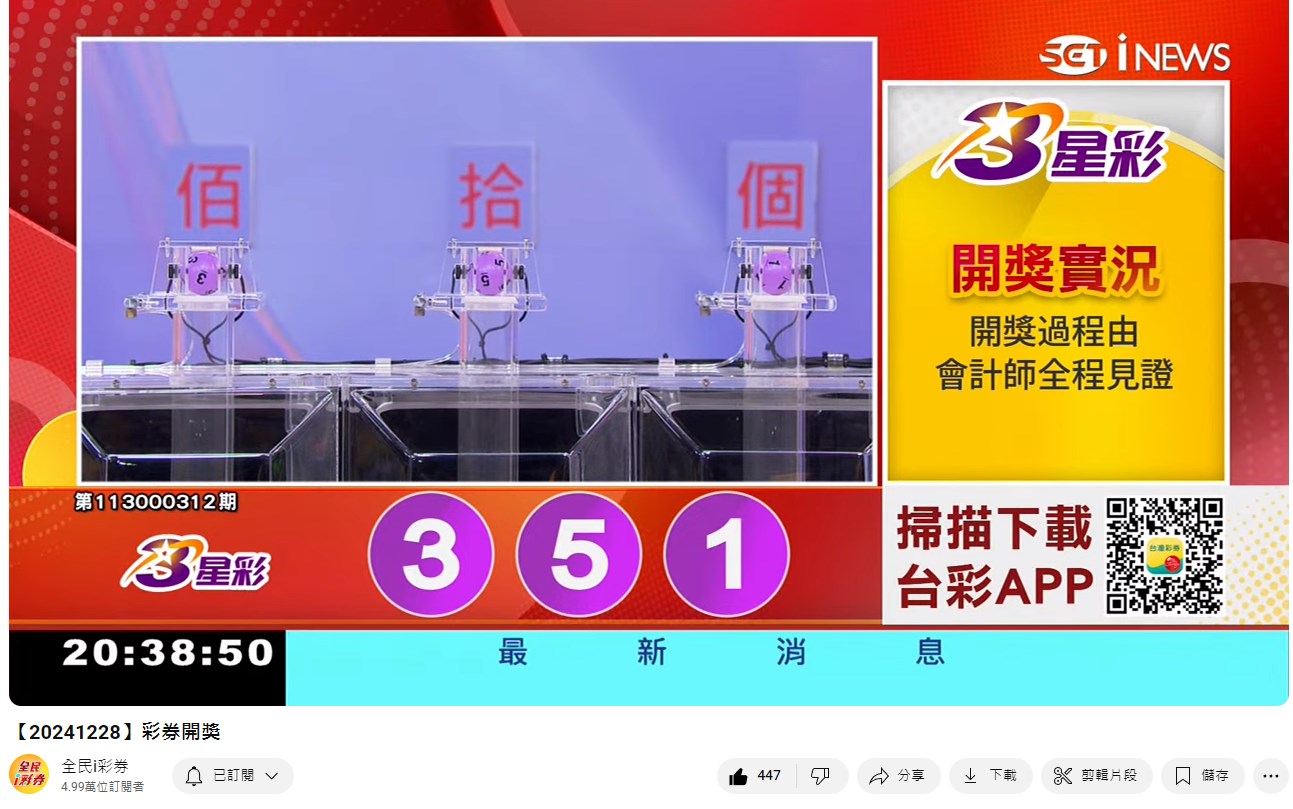 備註: 台彩因給全民兌獎方便,會在電視節目播完後,於全民i彩券YT官方頻道
