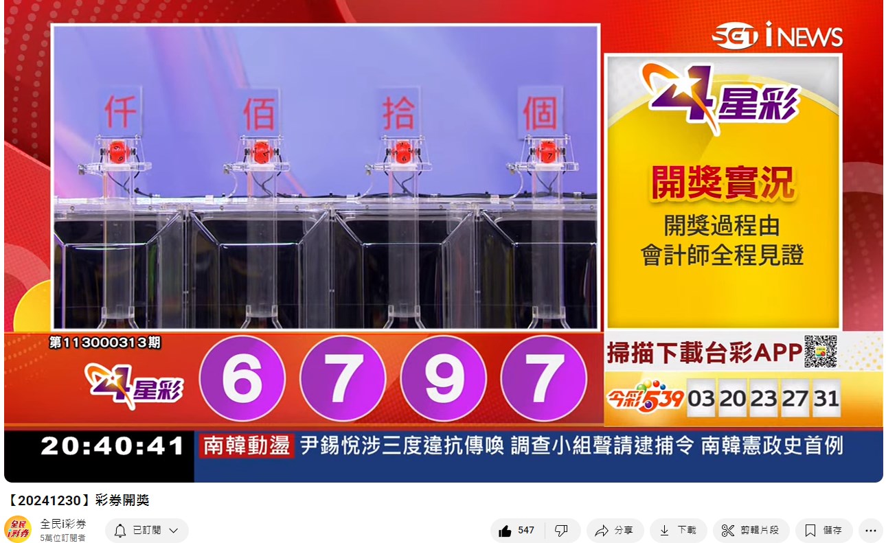 備註: 台彩因給全民兌獎方便,會在電視節目播完後,於全民i彩券YT官方頻道