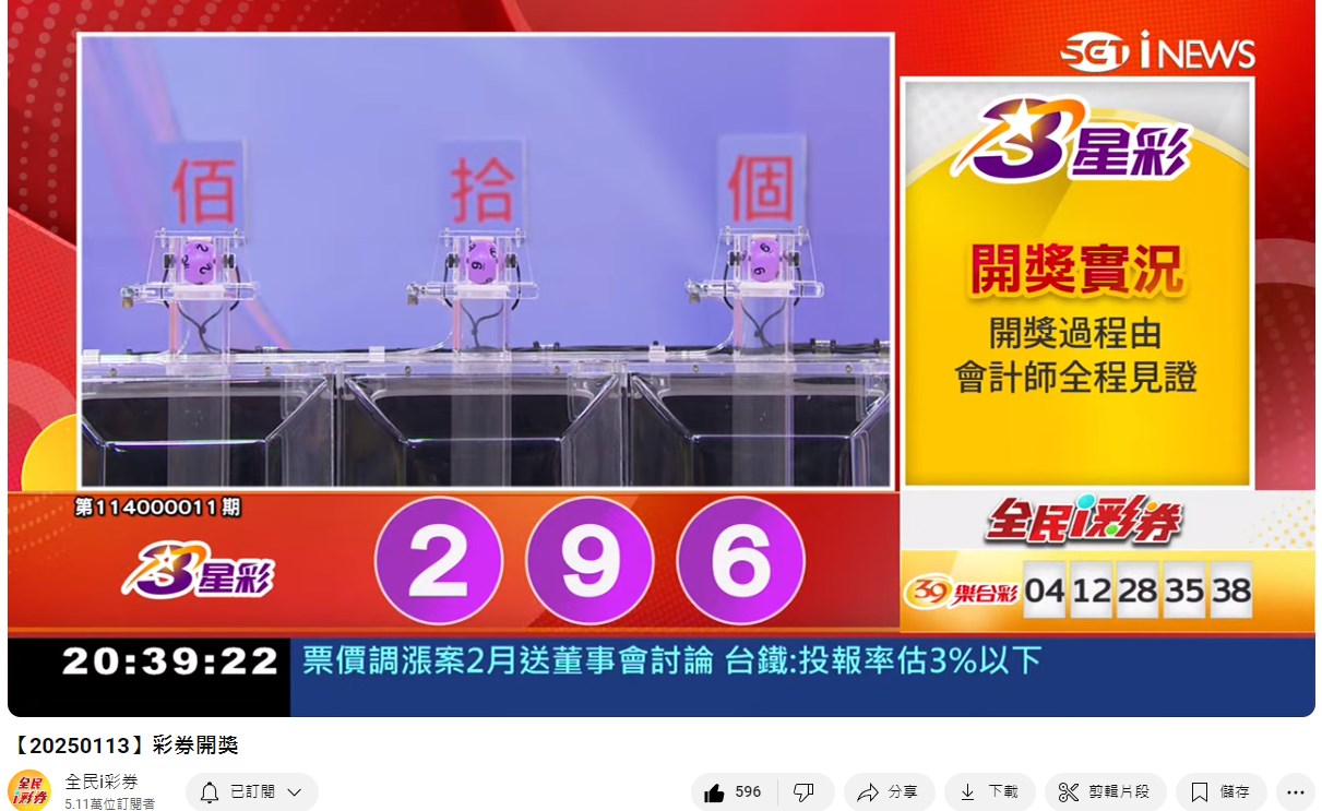 備註: 台彩因給全民兌獎方便,會在電視節目播完後,於全民i彩券YT官方頻道