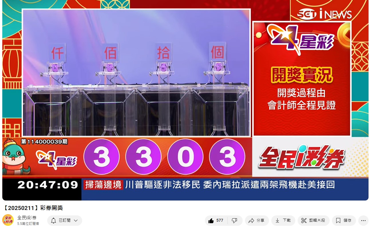 備註: 台彩因給全民兌獎方便,會在電視節目播完後,於全民i彩券YT官方頻道