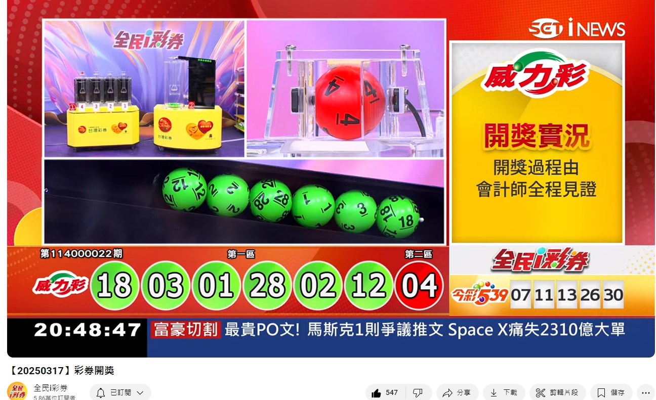專區【全民i彩券】台灣彩券開獎實況轉播 威力彩、今彩539、三星彩、四星彩 |三立新聞網 SETN.com - YouTube