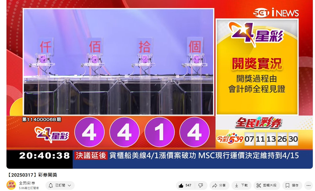 專區【全民i彩券】台灣彩券開獎實況轉播 威力彩、今彩539、三星彩、四星彩 |三立新聞網 SETN.com - YouTube