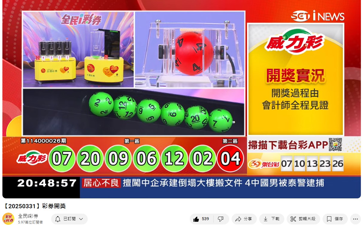 專區【全民i彩券】台灣彩券開獎實況轉播 威力彩、今彩539、三星彩、四星彩 |三立新聞網 SETN.com - YouTube