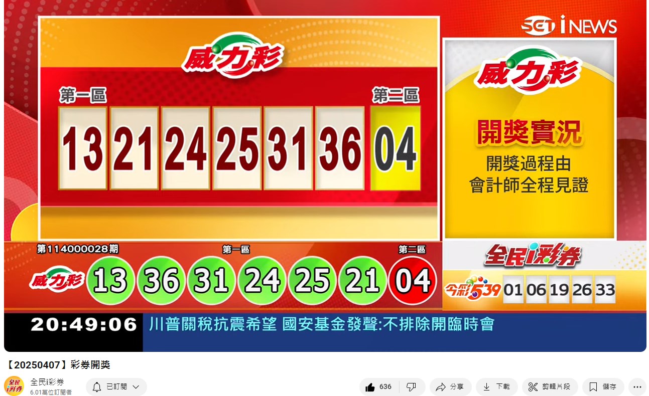 114年4月07日彩券開獎 來自全民i彩券YT [三立新聞網SETN][4月08日重播]