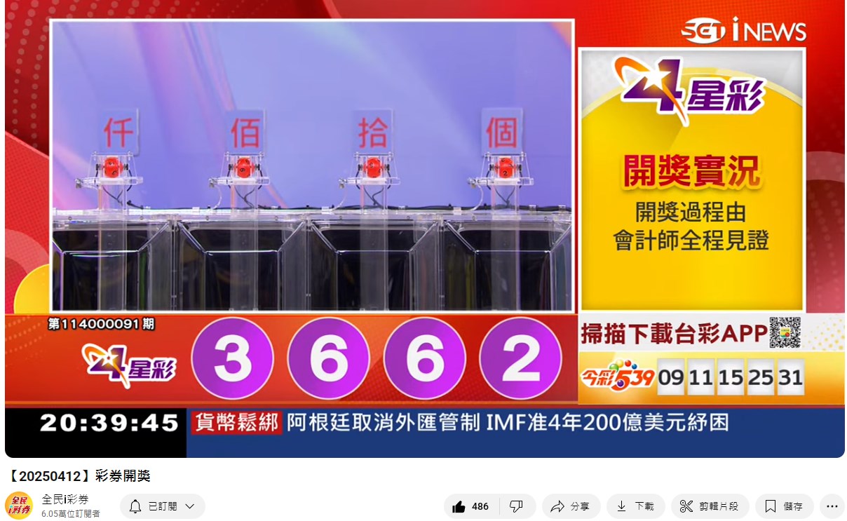 備註: 台彩因給全民兌獎方便,會在電視節目播完後,於全民i彩券YT官方頻道