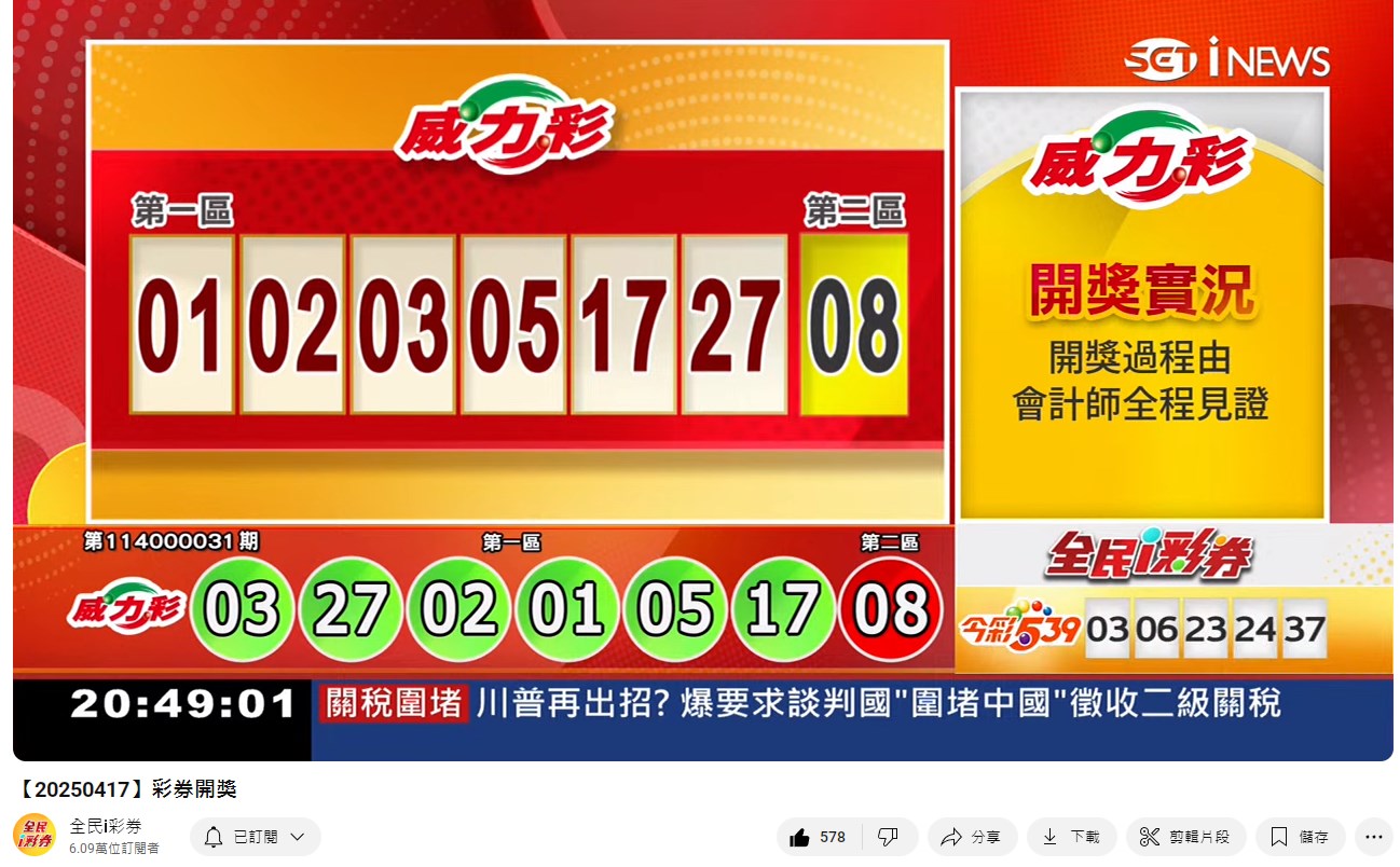114年4月17日彩券開獎 來自全民i彩券YT [三立新聞網SETN][4月18日重播]