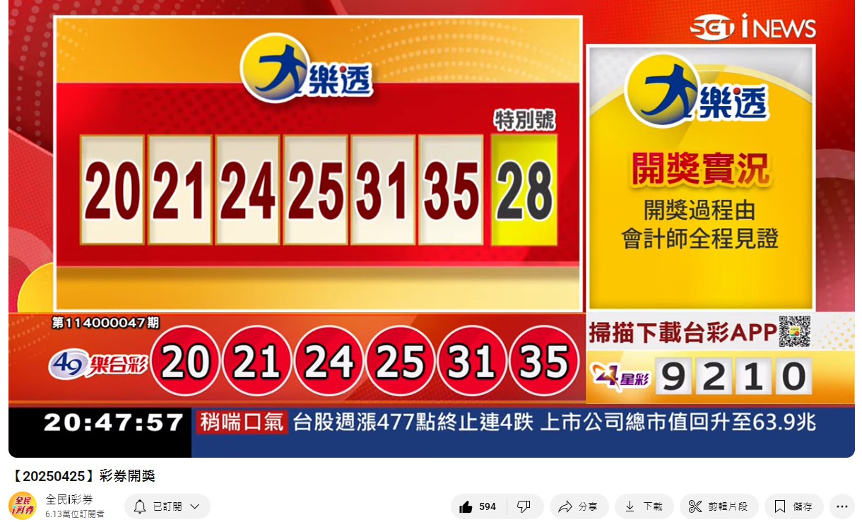 備註: 台彩因給全民兌獎方便,會在電視節目播完後,於全民i彩券YT官方頻道