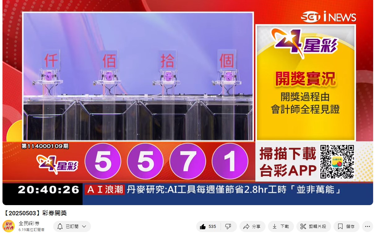 備註: 台彩因給全民兌獎方便,會在電視節目播完後,於全民i彩券YT官方頻道