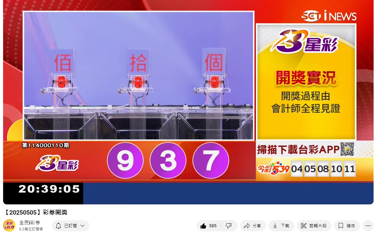備註: 台彩因給全民兌獎方便,會在電視節目播完後,於全民i彩券YT官方頻道