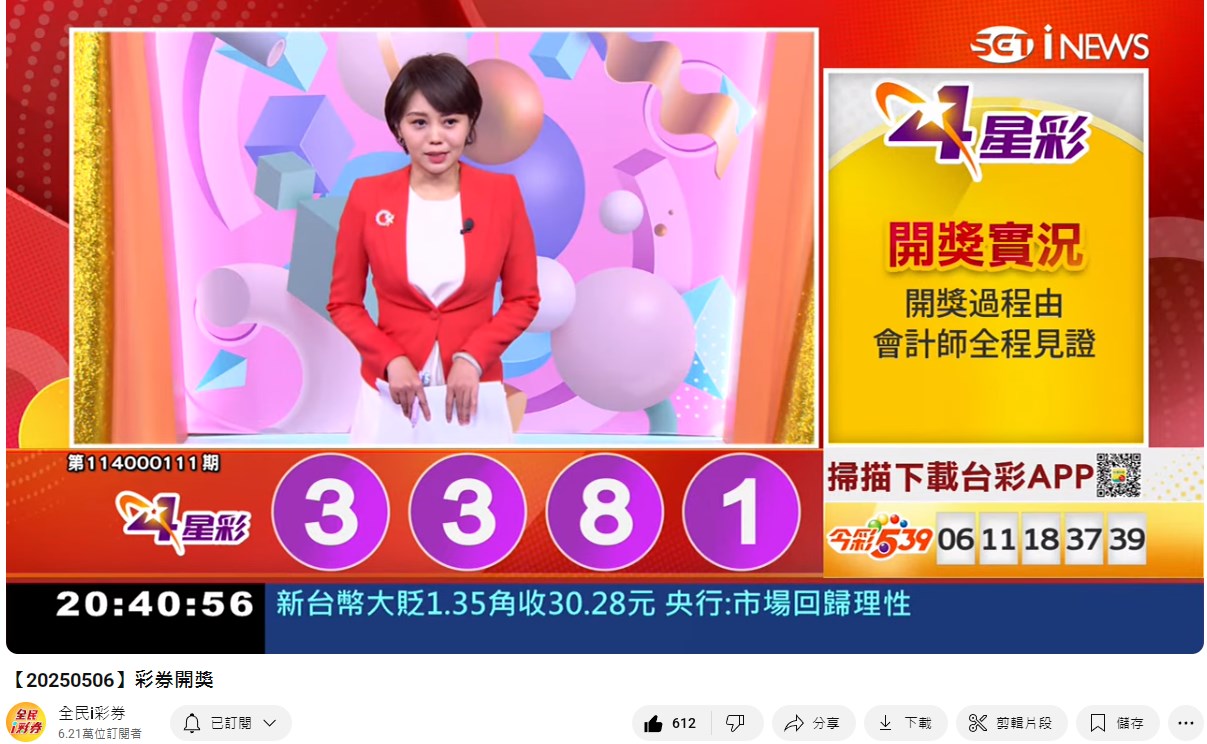 備註: 台彩因給全民兌獎方便,會在電視節目播完後,於全民i彩券YT官方頻道