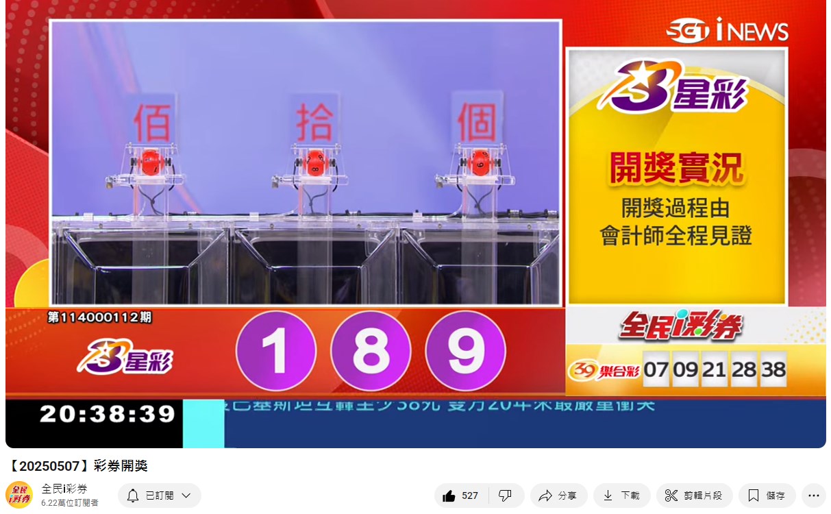 備註: 台彩因給全民兌獎方便,會在電視節目播完後,於全民i彩券YT官方頻道