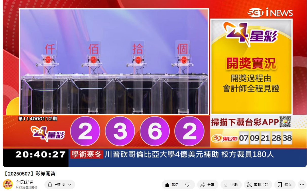 備註: 台彩因給全民兌獎方便,會在電視節目播完後,於全民i彩券YT官方頻道