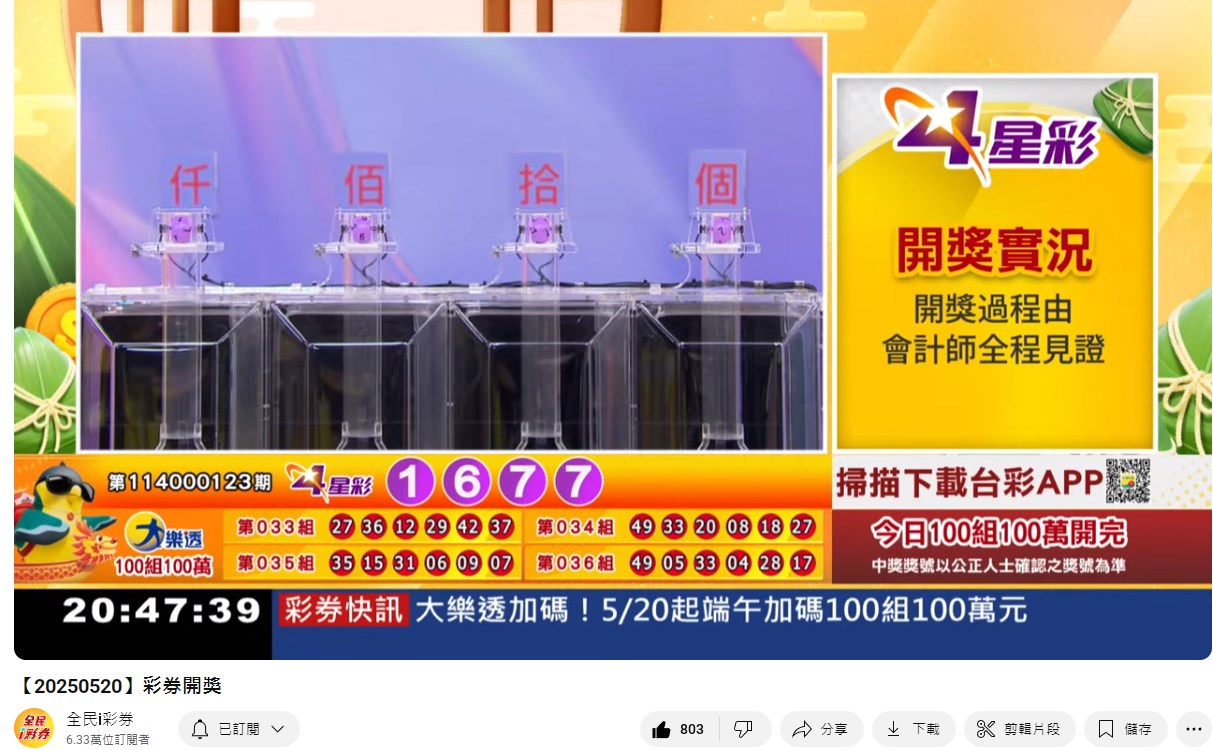 備註: 台彩因給全民兌獎方便,會在電視節目播完後,於全民i彩券YT官方頻道
