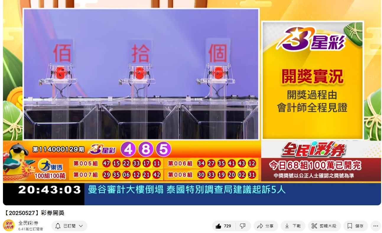 備註: 台彩因給全民兌獎方便,會在電視節目播完後,於全民i彩券YT官方頻道