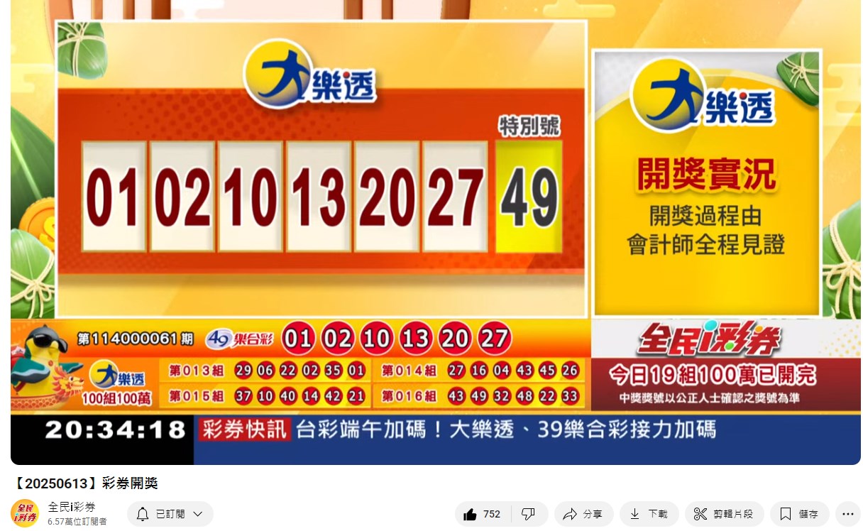 備註: 台彩因給全民兌獎方便,會在電視節目播完後,於全民i彩券YT官方頻道