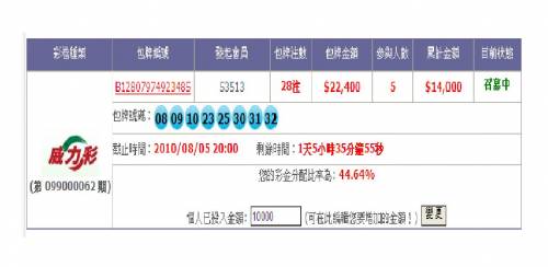 此組包牌的總金額為$22,400,而我個人投入此組包牌的金額為$10,000,