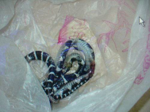 把那條蛇抓回去煮.昨晚想來想去還是不對結果今天早上跑去拿個塑膠袋把去旗山看那條蛇.那條蛇還在.......屍體還完整所以就把蛇用夾子夾起來之後到附近的土堆把他埋了