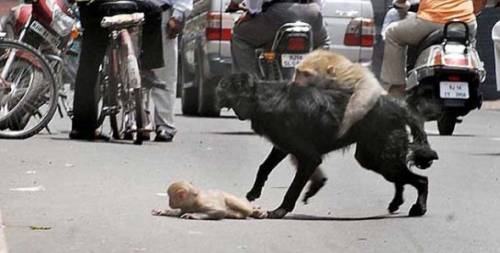 在印度首都新德里的街頭,人們經常能夠看到猴子撿東西吃的景象。當日,這只小猴子不幸被一輛快速穿過的電動車撞傷,隨後又被附近遊蕩的一條野狗發現。就在猴寶寶即將葬身犬口時,猴媽媽勇敢地衝了上去,與野狗廝打在一起,它跳上野狗的背,瘋狂地撕咬對方直至將其趕跑。
