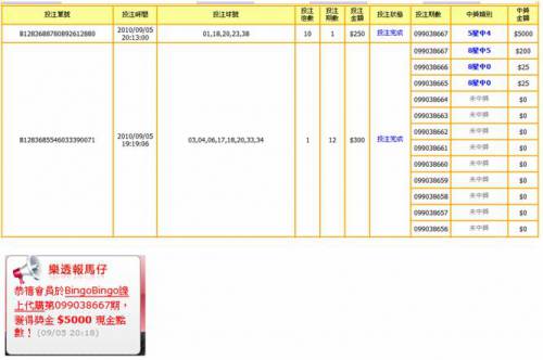 觀心大大!真的謝謝您的貴言,我今晚用線上投注(剛學會二三天),結果利用此臨時加注的一注,在加上我的近視又看錯,原是要選10期,結果投注成10倍,而我也沒看清楚,也許是運氣還不錯吧!我真的中5中4星*10倍